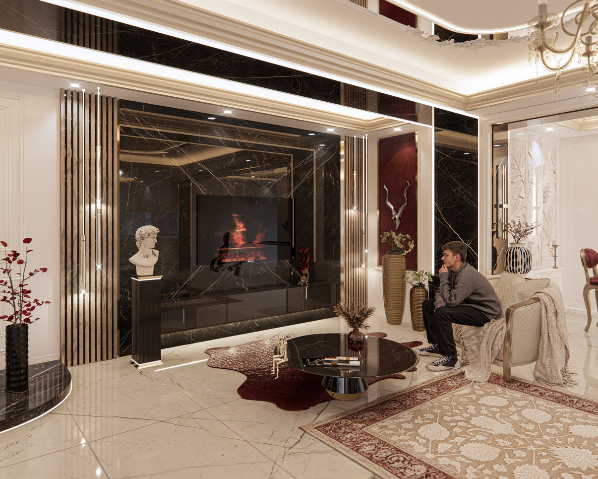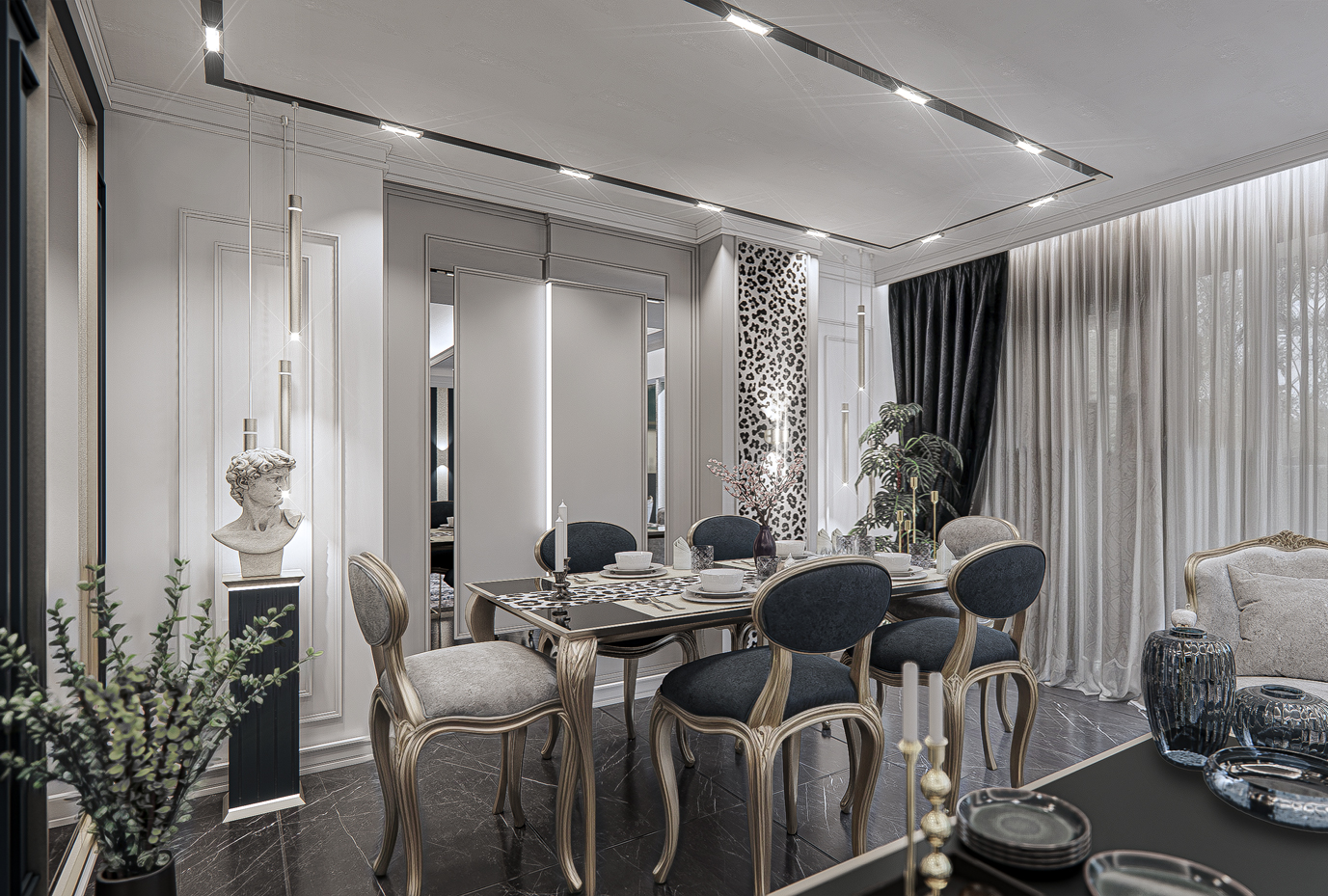 Neoclassical design is a style that combines the grandeur of classic details with modern elegance! This space, with its symmetrical lines, luxurious materials, and precise lighting, beautifully captures a sense of warmth and grandeur.