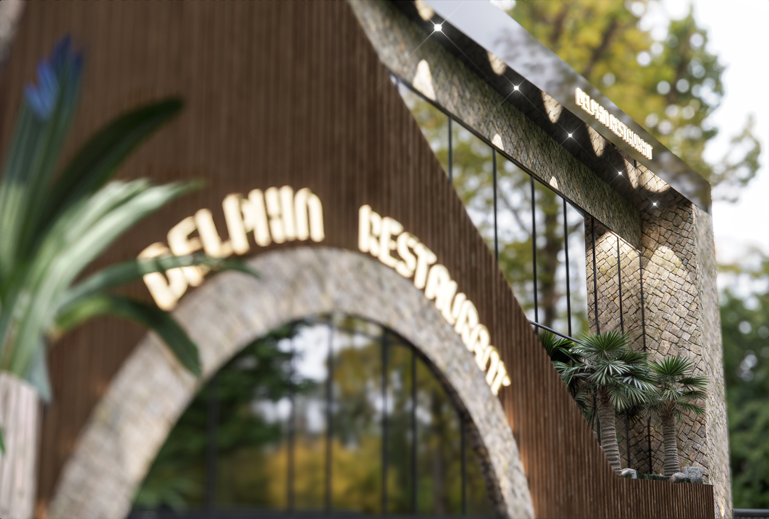 Located in the Baku, Delphin Restaurant is a masterpiece of contemporary architecture that seamlessly integrates natural elements with modern aesthetics. The design concept is inspired by organic forms, using a combination of wood, stone, and glass to create a warm and inviting atmosphere.
