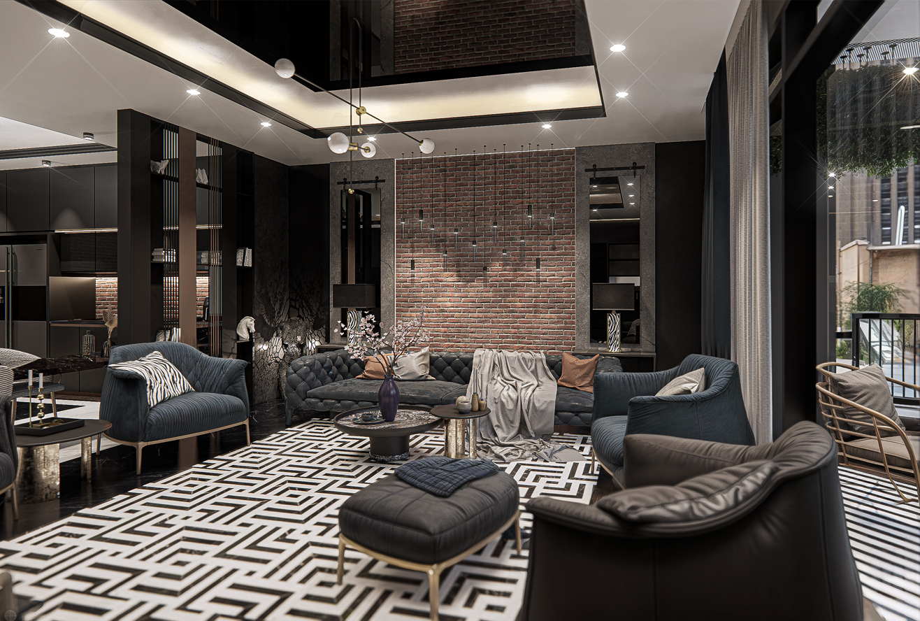 In the entrance and living spaces, the combination of textured gray walls and exposed brick serves as an ideal backdrop for displaying artistic elements.