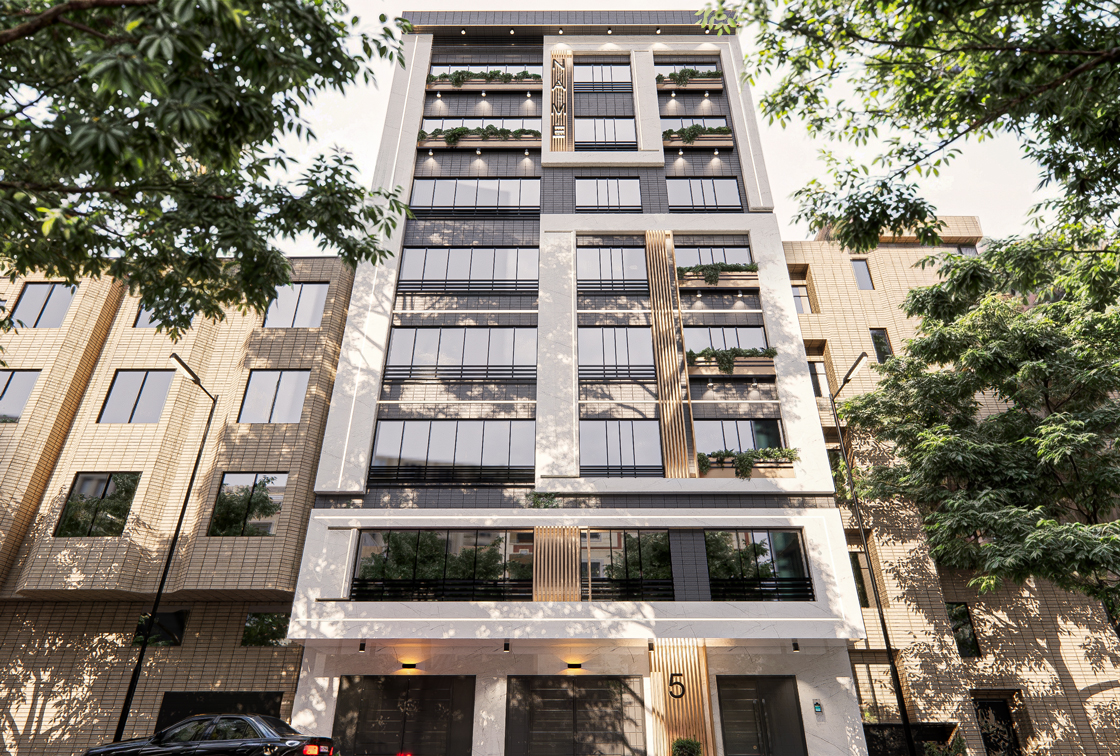 The facade design of this residential building seeks to strike a balanced composition of simplicity, order, and architectural detail.Strategically placed green planters soften the facade while promoting a sense of sustainable aesthetics and a better connection with the urban environment.